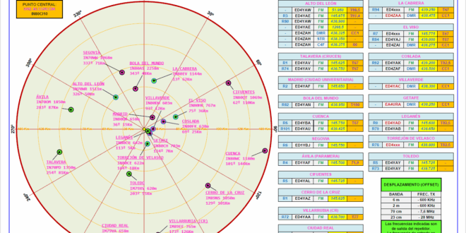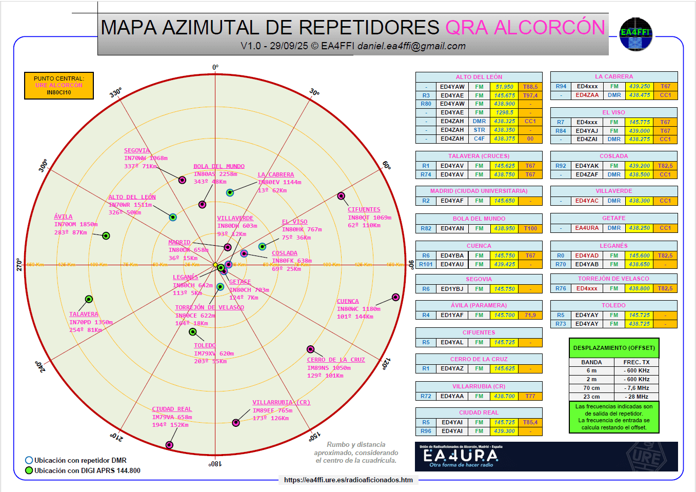 Nuestro compañero Daniel, EA4FFI ha publicado un mapa azimutal de los repetidores de la zona central de España.